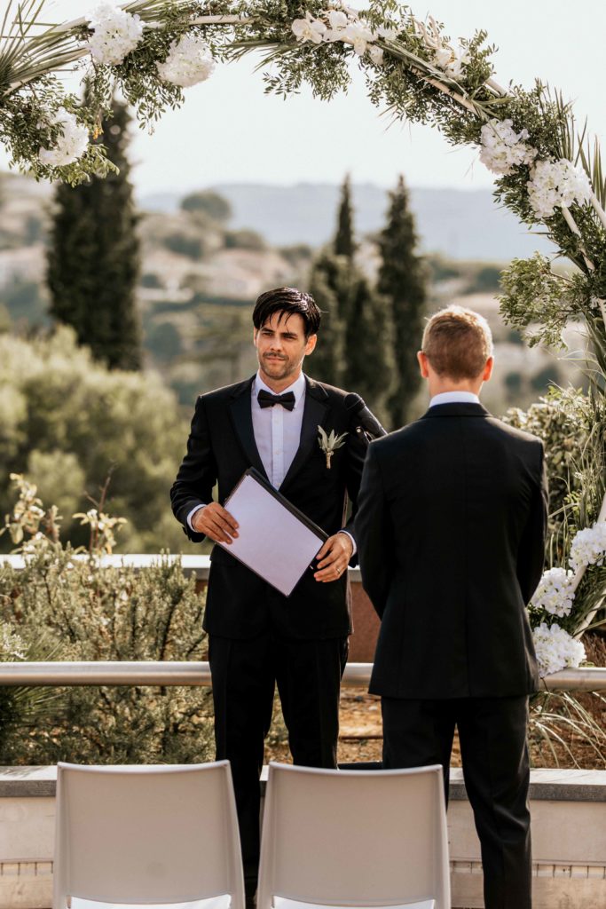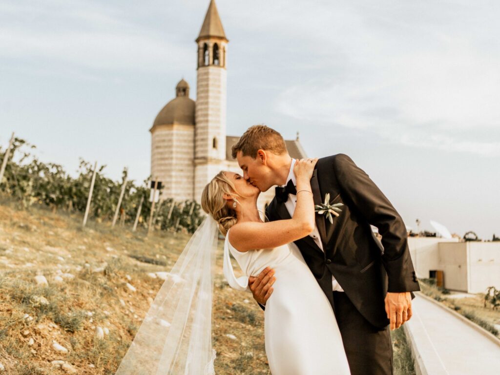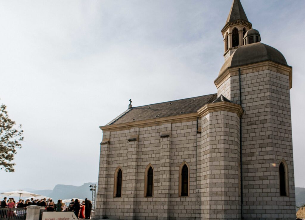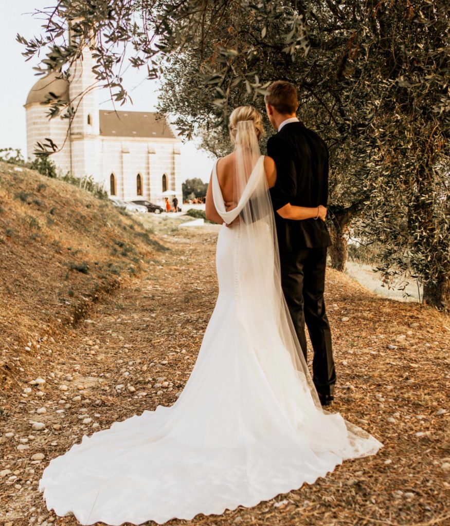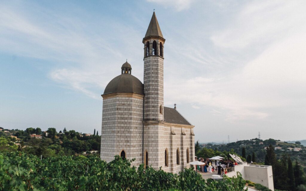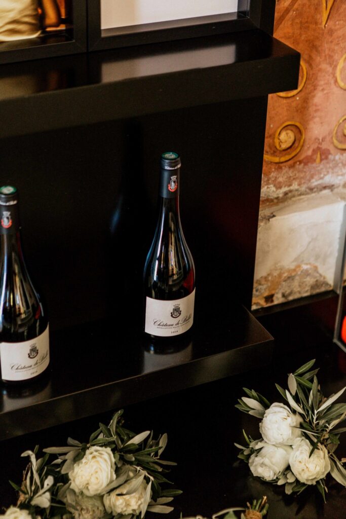 The lay ceremony was celebrated in front of this chapel at the highest point of the castle. Thanks to the good weather, the toast was held outside to the rhythm of the cicadas, around the vines.