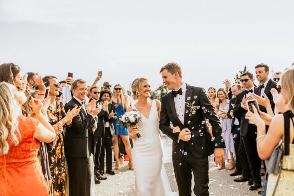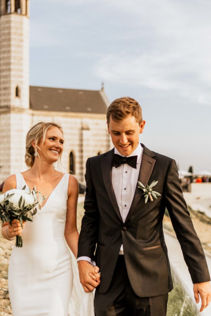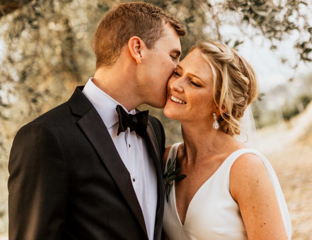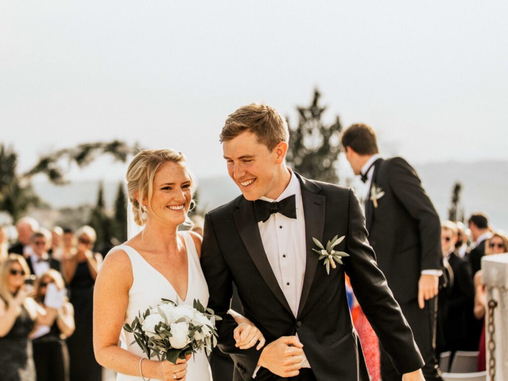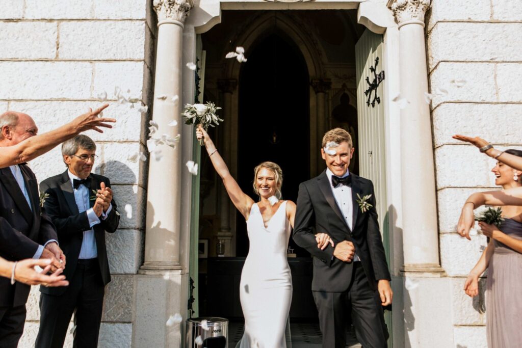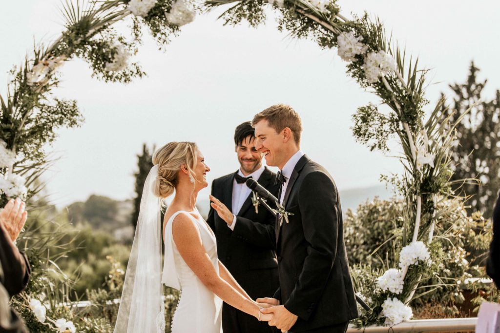 The lay ceremony was celebrated in front of this chapel at the highest point of the castle. Thanks to the good weather, the toast was held outside to the rhythm of the cicadas, around the vines.