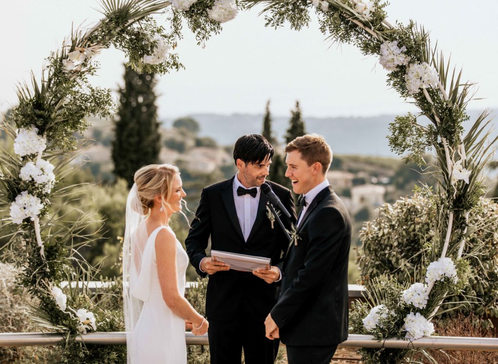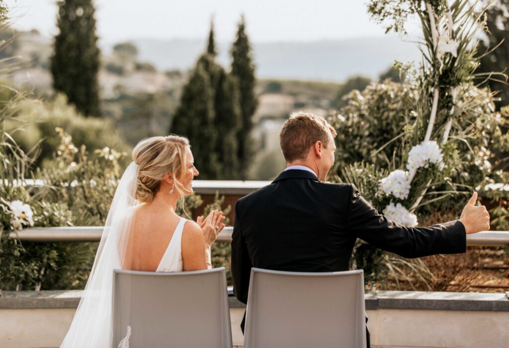 Although their civil wedding was held at home in the country of Queen Elizabeth, these lovers of France wanted their secular ceremony to take place in Nice and more precisely at the Château de Bellet.